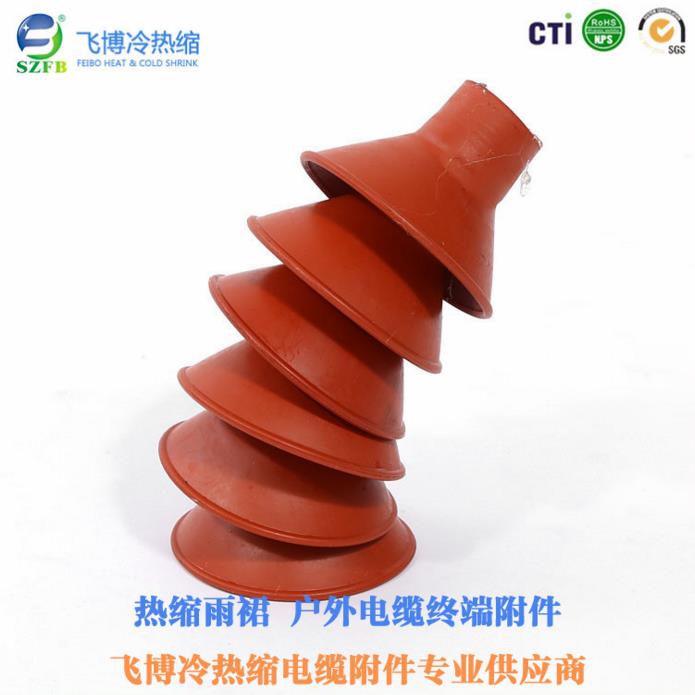 其次我們來(lái)說(shuō)說(shuō)10kv戶(hù)外電纜終端中的“戶(hù)外”,戶(hù)外的意思顧名思義就是室外,也就是說(shuō)在室外使用的。由于耐壓級(jí)別的不同,10kv和35kv屬于高壓電纜終端,所以為了穩(wěn)定運(yùn)行又把電纜終端分為戶(hù)內(nèi)電纜終端與戶(hù)外電纜終端,這次我們所說(shuō)的就是10kv戶(hù)外電纜終端。那么很多人又會(huì)對(duì)其有所疑問(wèn)——戶(hù)內(nèi)戶(hù)外的區(qū)別在哪?其實(shí)戶(hù)內(nèi)戶(hù)外很大的區(qū)別之處就是戶(hù)外是有雨裙的,因?yàn)樵趹?hù)外使用,雨裙的很大作用就是防雨,有了雨裙的保護(hù)電纜終端在室外就能更加穩(wěn)定的運(yùn)行。當(dāng)然也可以從廠家附帶的產(chǎn)品配套表來(lái)區(qū)別戶(hù)內(nèi)戶(hù)外的不同。以下為10kv戶(hù)外電纜終端的雨裙圖: